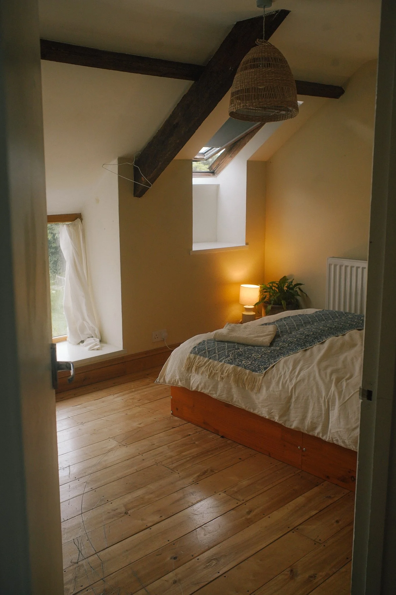 A large room with a king size bed, along with bedside table, plenty of shelving and hanging space for garments. Skylight windows with black-out blinds and a floor length window overlooking the front garden with curtains. Decorated with natural dye textiles and artworks.