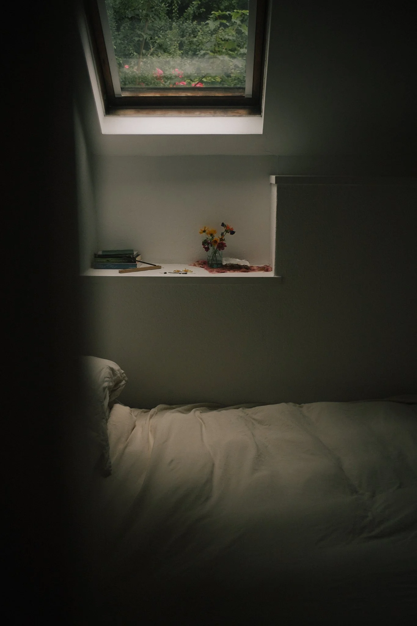 A small room with a queen floor mattress along with bedside table and hanging space for garments. With skylight window and full black-out blinds. Decorated with natural dye textiles and artworks.