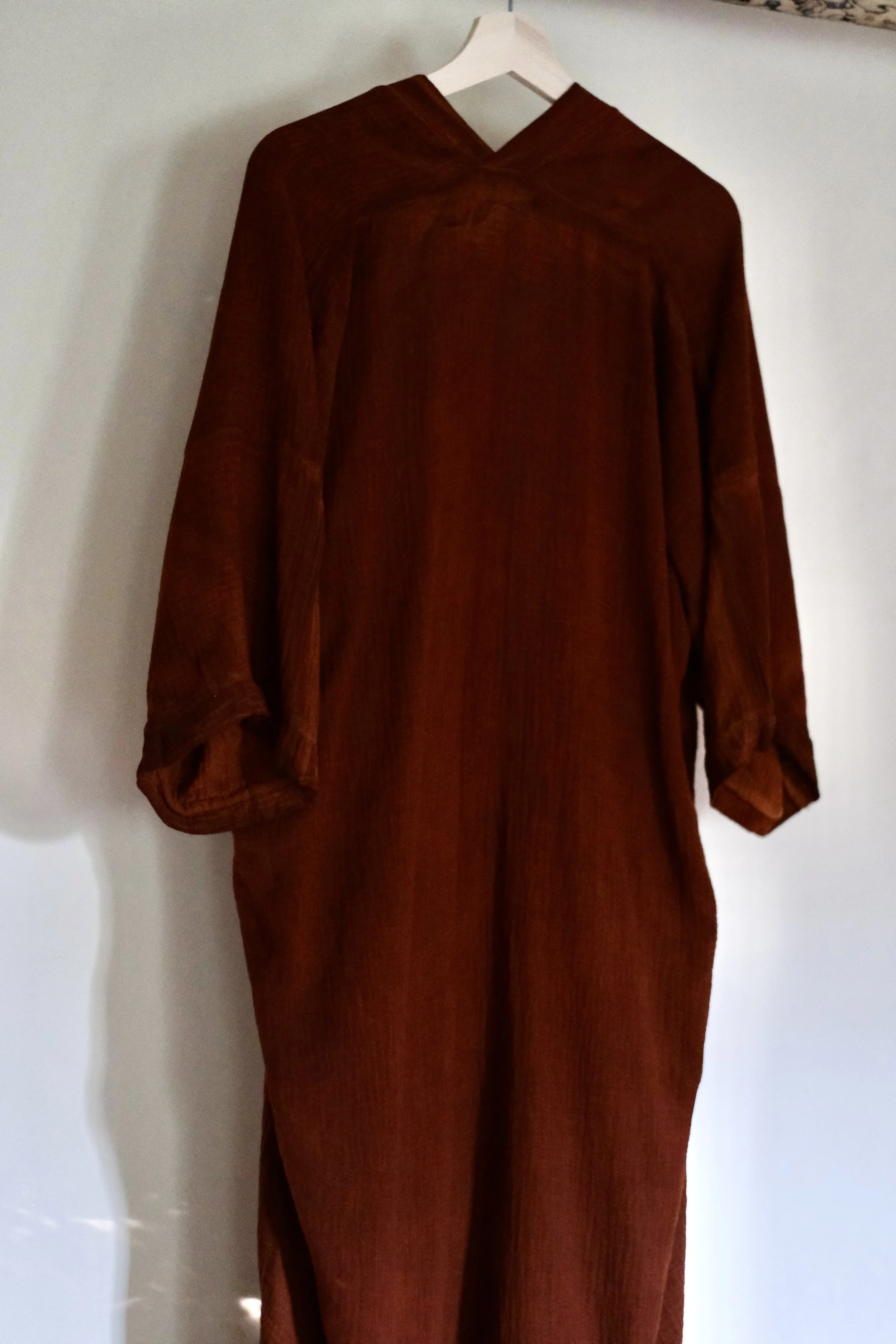 Dyed by hand with mangrove root, Sacred Root holds the deepest burgundy of earth and tide. Each robe is imbued with the spirit of the mangroves — a living ecosystem where roots breathe between land and water, where colour rises from the soil itself.