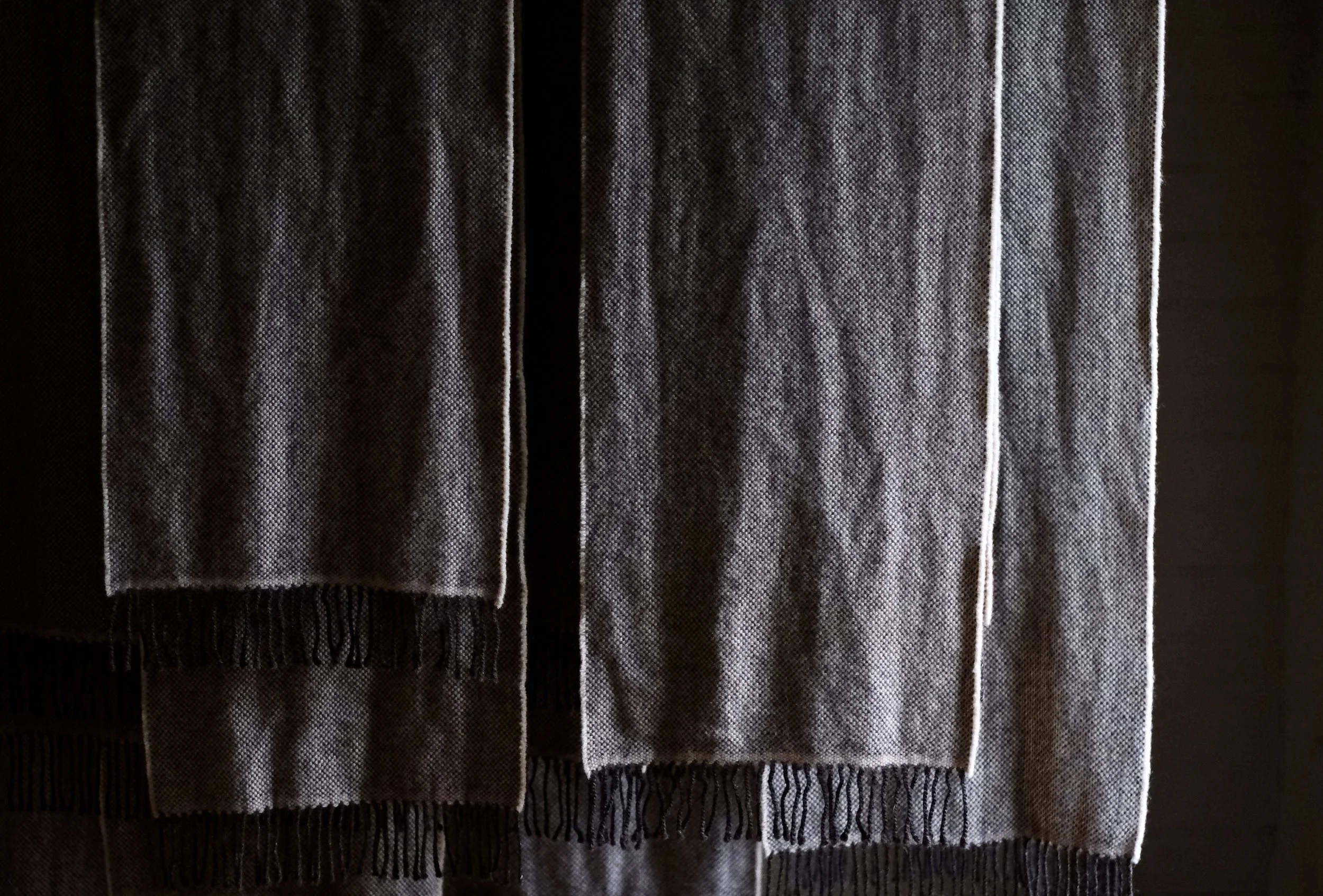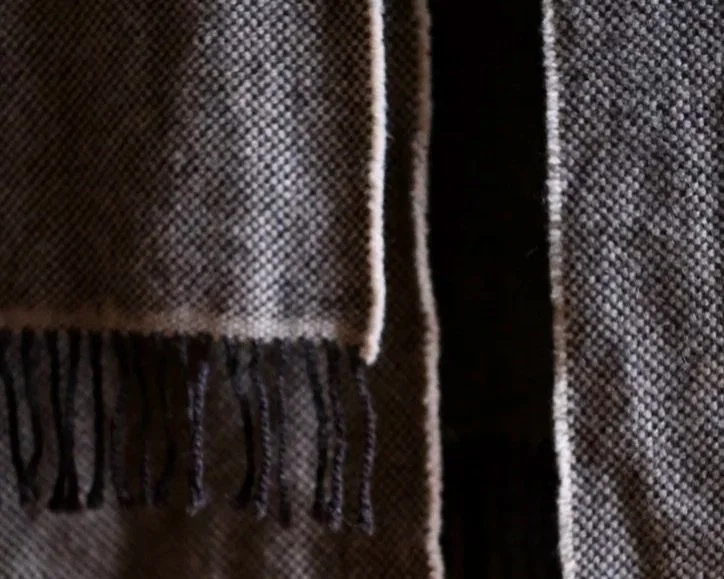 The scarves and blanket scarves will be available in a few limited edtion colours. The warp is a natural undyed dark brown/black fleece colour, of 100% British wool, recycled from the BTQ/Natural Fibre Co. deadstock collection as a brilliant new sustainability scheme to reduce waste.